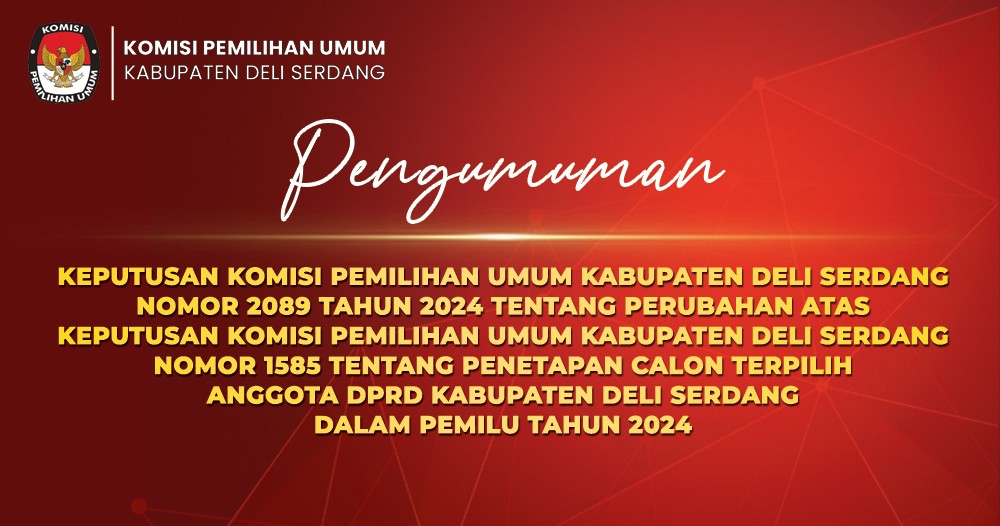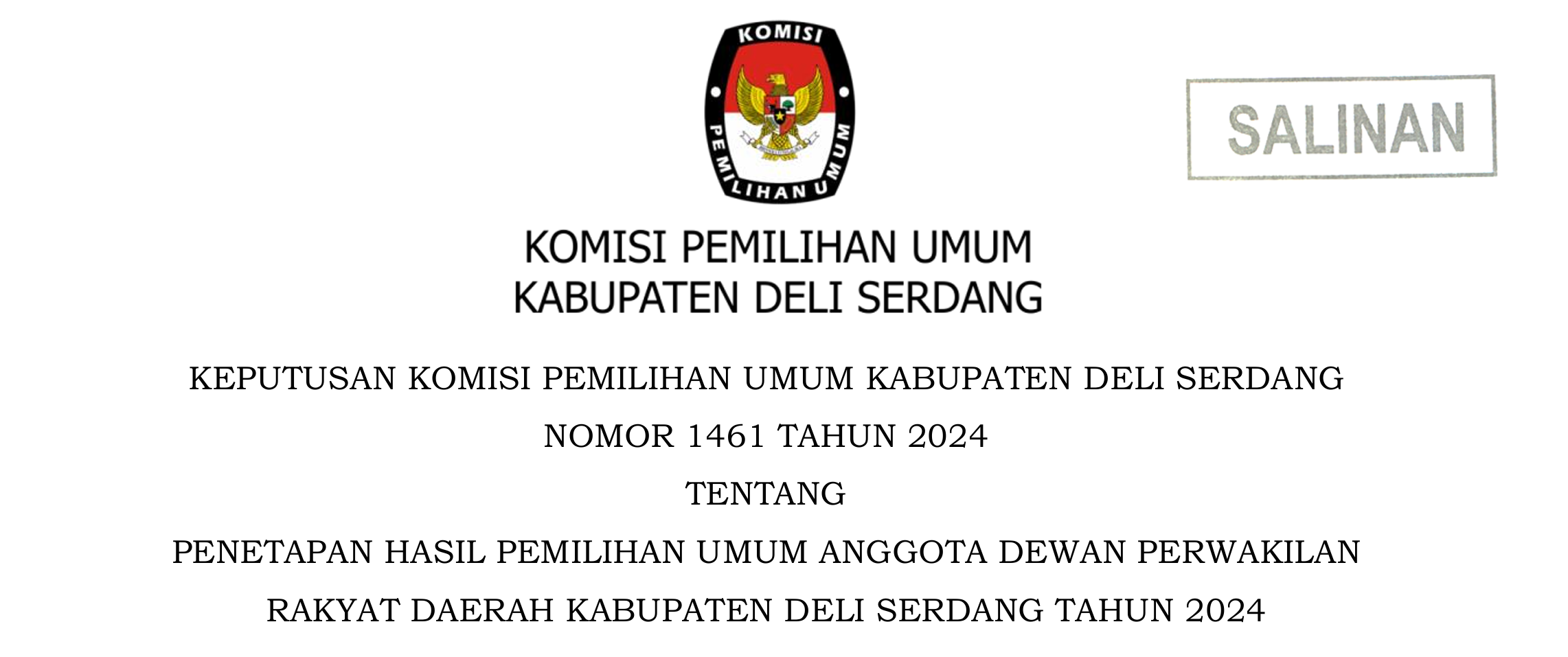 Keputusan KPU Kabupaten Deli Serdang Nomor 2089 Tahun 2024 Tentang Perubahan Atas Keputusan KPU Kabupaten Deli Serdang Nomor 1585 Tentang Penetapan Calon Terpilih Anggota DPRD Kabupaten Deli Serdang Dalam Pemilihan Umum Tahun 2024 KLIK DISINI!!!