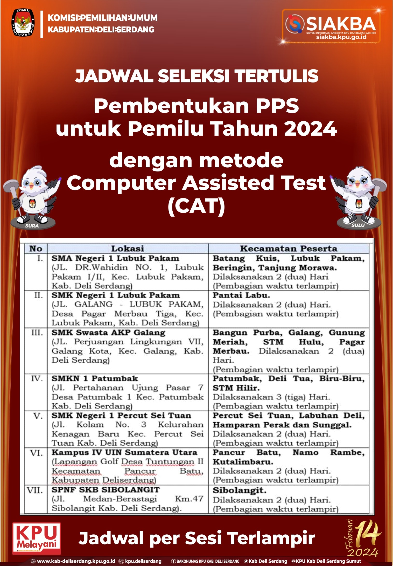KPU Kabupaten Deli Serdang mengundang calon anggota PPS yang dinyatakan Memenuhi Syarat dan Lulus tahap seleksi administasi untuk hadir dalam Seleksi Tertulis dengan metode Computer Assited Test (CAT) tepat waktu sesuai dengan jadwal pada: