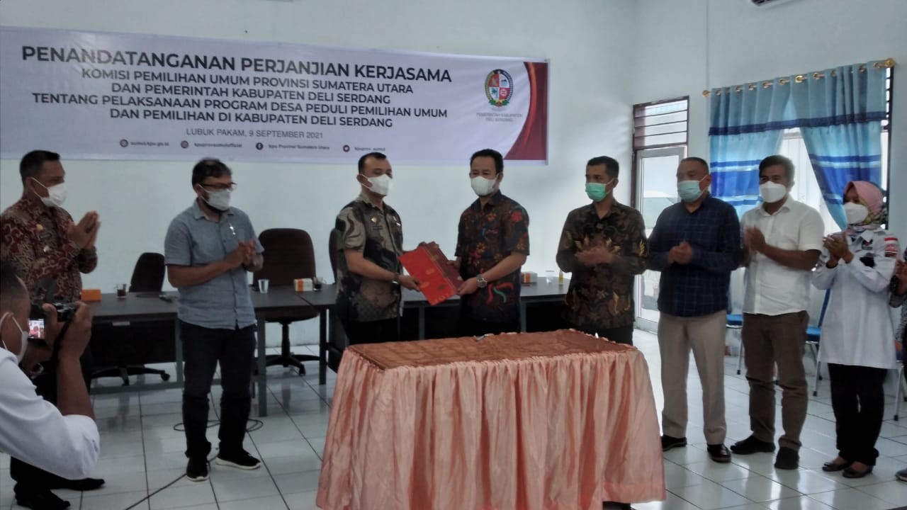 KPU Provinsi Sumatera Utara dan Pemerintah Kab. Deli Serdang melaksanakan penandatangan perjanjian kerjasama tentang Pelaksanaan Program Desa Peduli Pemilihan Umum dan Pemilihan di Kabupaten Deli Serdang pada hari Kamis (09/09/2021) di Aula Kantor Dinas Pemberdayaan Masyarakat dan Desa Kabupaten Deli Serdang.