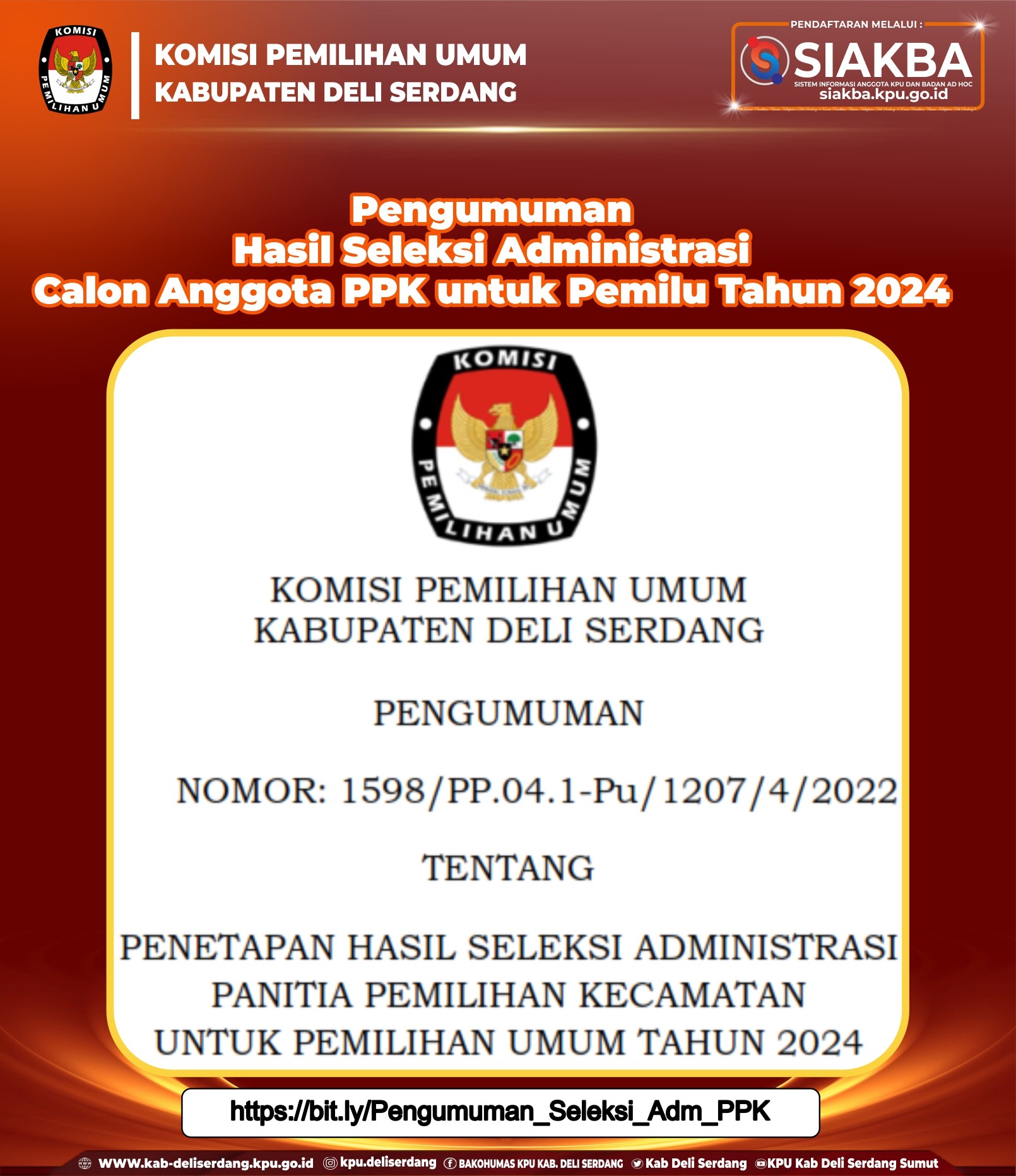 Berdasarkan Berita Acara Rapat Pleno KPU Kabupaten Deli Serdang Nomor 1781/PP.04.1-BA/1207/4/2022 tanggal 8 Desember 2022 tentang Rapat Pleno Penetapan Hasil Seleksi Tertulis Calon Anggota Panitia Pemilihan Kecamatan (PPK) untuk Pemilu Tahun 2024 dengan menggunakan sistem Computer Assisted Test (CAT), disampaikan hal-hal sebagai berikut: