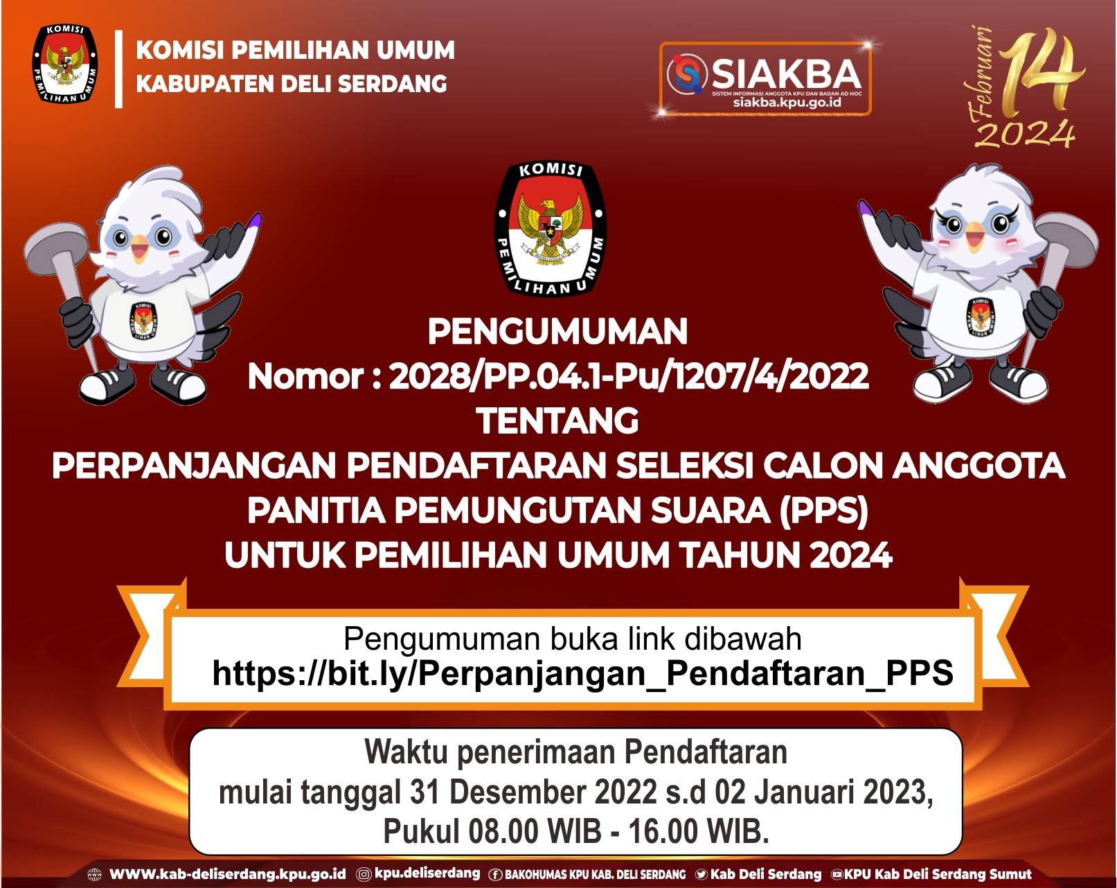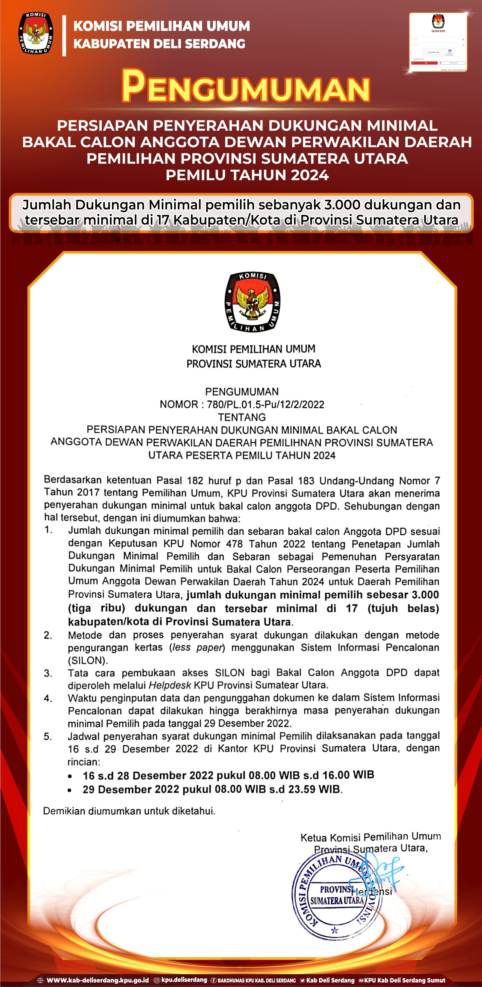 KPU Kabupaten Deli Serdang memberikan kesempatan kepada masyarakat untuk menyampaikan tanggapan dan masukan secara tertulis terhadap calon anggota PPK yang lulus seleksi tertulis. Tanggapan dan masukan dapat disampaikan kepada KPU Kabupaten Deli Serdang melalui email subbaghukumsdm@gmail.com atau datang langsung ke Kantor KPU Kabupaten Deli Serdang di Jl. Karya Jasa No. 8 Lubuk Pakam. Demikian pengumuman ini disampaikan untuk diketahui.