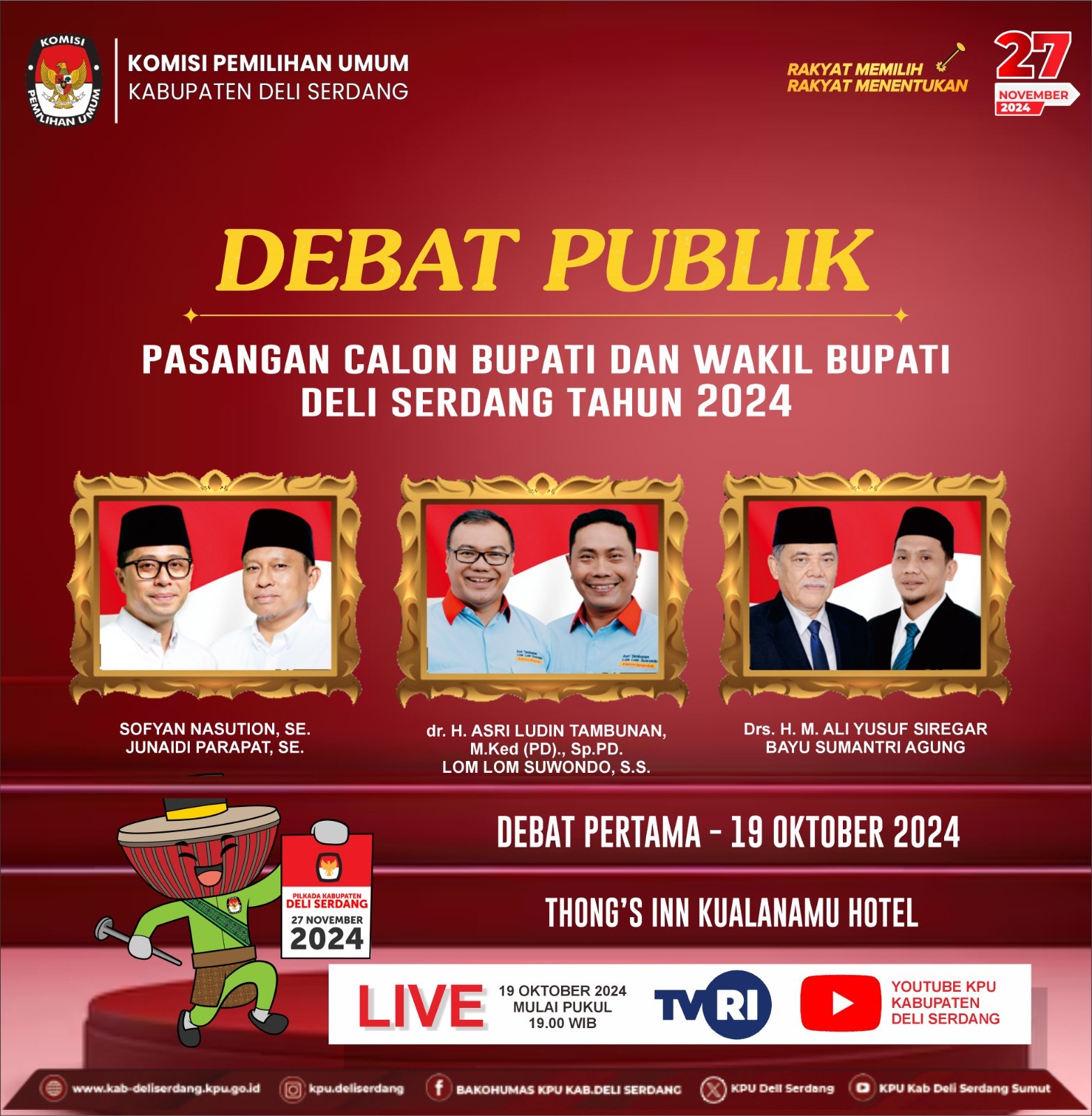 Saksikan Penanyangan Debat Publik Pertama Pasangan Calon Bupati Dan Wakil Bupati Deli Serdang Tahun 2024 secara live di TVRI dan channel Youtube KPU Kabupaten Deli Serdang pada tanggal 19 Oktober 2024