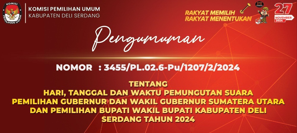 Berikut Pengumuman Hari, Tanggal dan Waktu Pemungutan Suara Pemilihan Gubernur Dan Wakil Gubernur Serta Bupati Dan Wakil Bupati Deli Serdang Tahun 2024 (KLIK DISINI!)