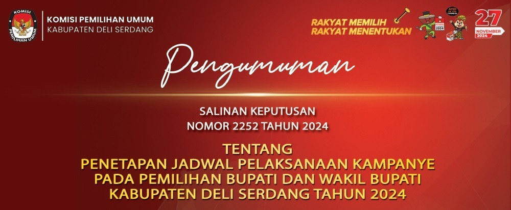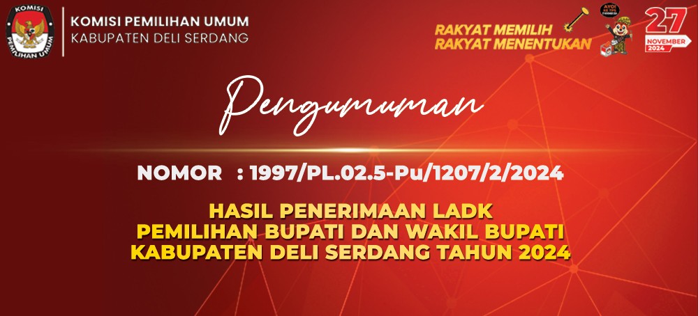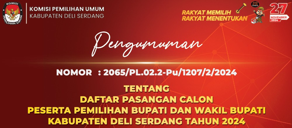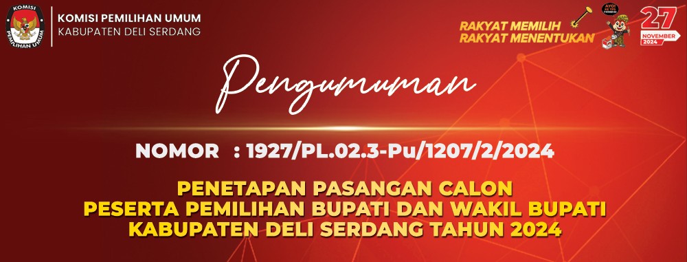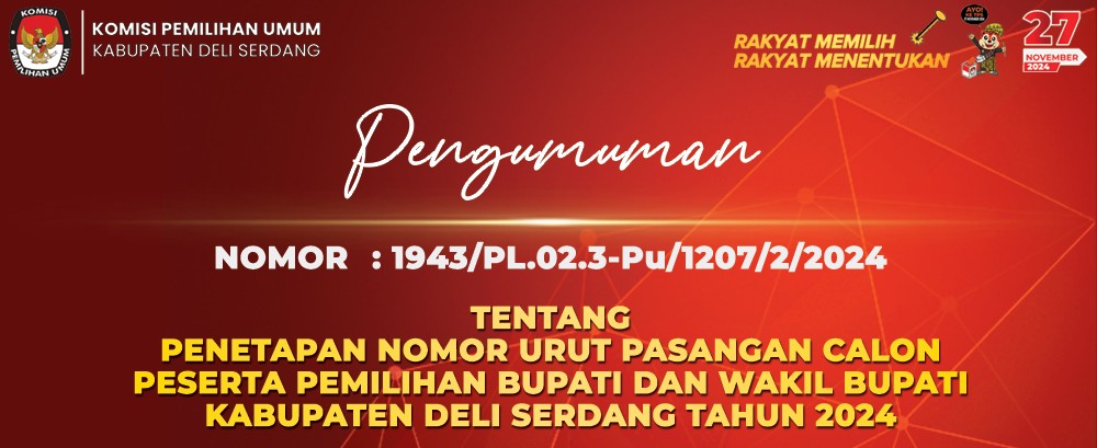 Pengumuman Nomor: 1943/PL.02.3-Pu/1207/2/2024 Tentang Penetapan Nomor Urut Pasangan Calon Peserta Pemilihan Bupati dan Wakil Bupati Kabupaten Deli Serdang Tahun 2024. (KLIK DISINI!!!)