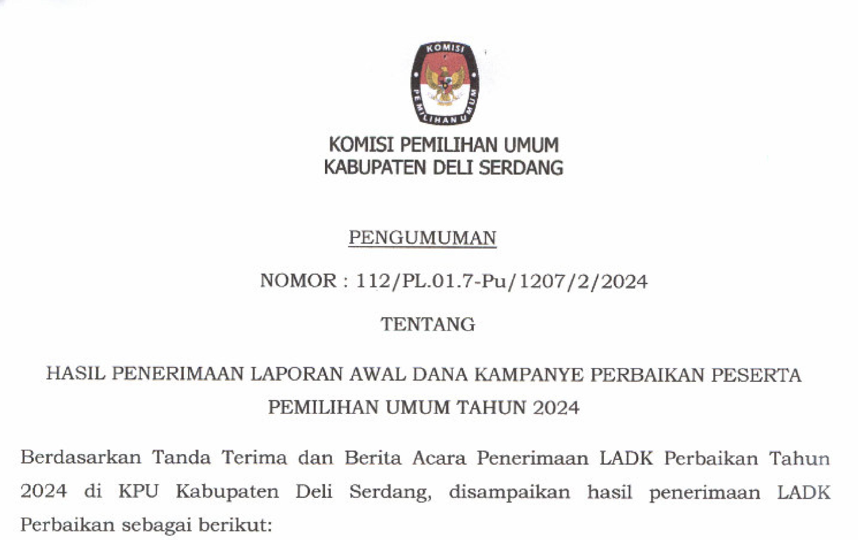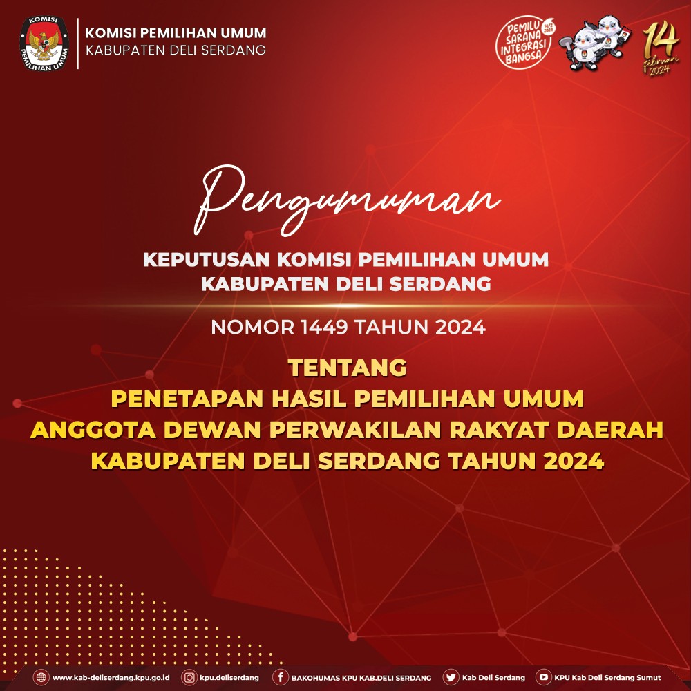 Keputusan Komisi Pemilihan Umum Kabupaten Deli Serdang Nomor 1449 Tahun 2024 Tentang Penetapan Hasil Pemilihan Umum Anggota Dewan Perwakilan Rakyat Daerah Kabupaten Deli Serdang Tahun 2024 selengkapnya KLIK DISINI !!!