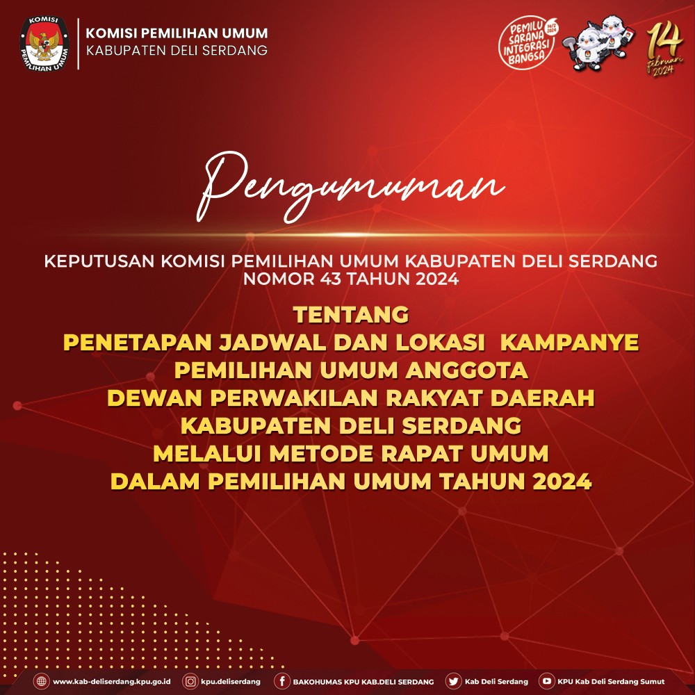 Keputusan Penetapan Jadwal dan Lokasi Kampanye Pemilihan Umum Anggota DPRD Kabupaten Deli Serdang melalui Metode Rapat Umum dalam Pemiihan Umum Tahun 2024 selengkapnya KLIK DISNI !!!