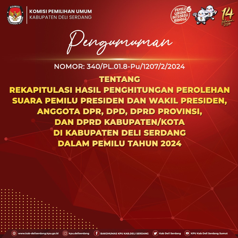 Pengumuman Rekapitulasi Hasil Penghitungan Perolehan Suara Pemilu Presiden dan Wakil Presiden, Anggota DPR, DPD, DPRD Provinsi, dan DPRD Kabupaten/Kota di Kabupaten Deli Serdang Dalam Pemilu Tahun 2024 Selengkapnya KLIK DISINI !!!